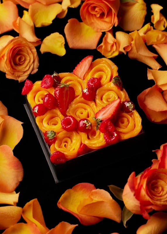 これまでのケーキの常識を覆し、見た瞬間にエテだと分かるような象徴的なケーキをつくろうと考え、思案の末に完成したのが、薔薇を象ったマンゴータルト「フルール・ド・エテ」です。