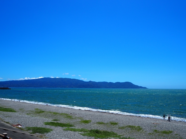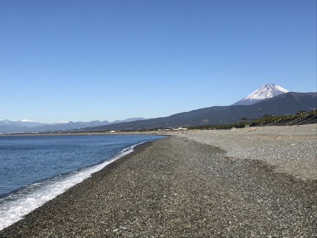 晴れた日には、海岸の向こうに広がる駿河湾越しに、雄大な富士山を望むことができます。