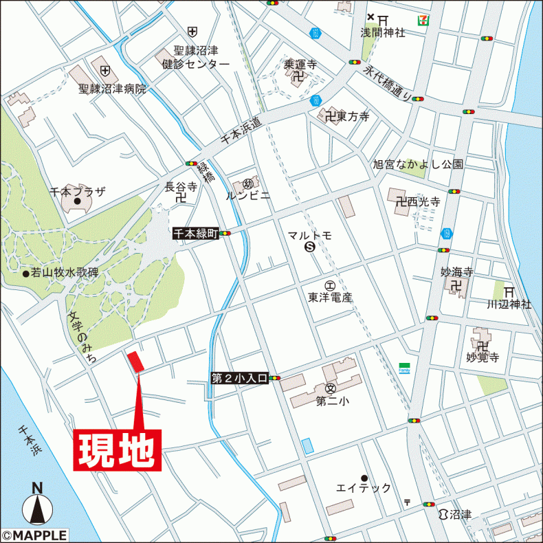 JR沼津駅まで徒歩圏内(約26分)、総合病院の聖隷沼津病院まで徒歩15分、生活利便性も良好。