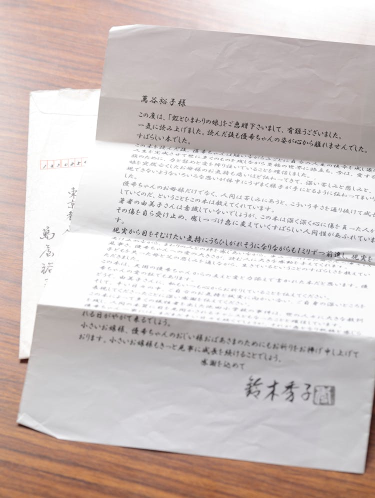私の叔母が以前、鈴木先生と親交があり、先生は池田小事件の後、優希をはじめ亡くなった8人の子供たちのために都内で静かにミサを挙げてくださいました。また、事件の2年後に私が出版した手記『虹とひまわりの娘』を読んで、叔母宛にとても心のこもったお手紙をくださったのですね。叔母はこの手紙をすぐに私に届けてくれたのですが、私にとっては再生の扉への招待状であり、いまも大切なお守りなんです。きょうはそれをお持ちしました。