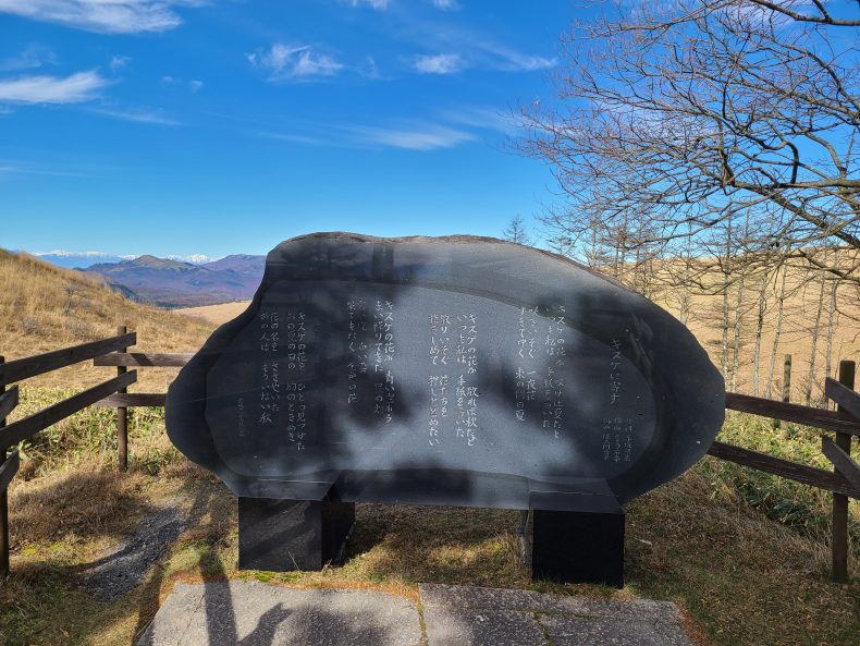 …因みに、モニュメントに刻まれた歌詞は、コロボックルの初代、手塚宗求(むねやす)さん作で、作詞は、青葉城恋唄で一世を風靡した「さとう宗幸」さん…歌うのは手塚さんを忍んで私が、雄大な草原に溶け込んだつもりで吟唱しました…