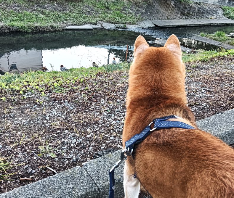 カモの集いにかんちゃん、興味津々。混ぜてもらって新年会でもやります?かんちゃんがこんなに見つめているのに全然気にしないでまったりするカモたちです。ゆったり穏やかな時が流れます☆